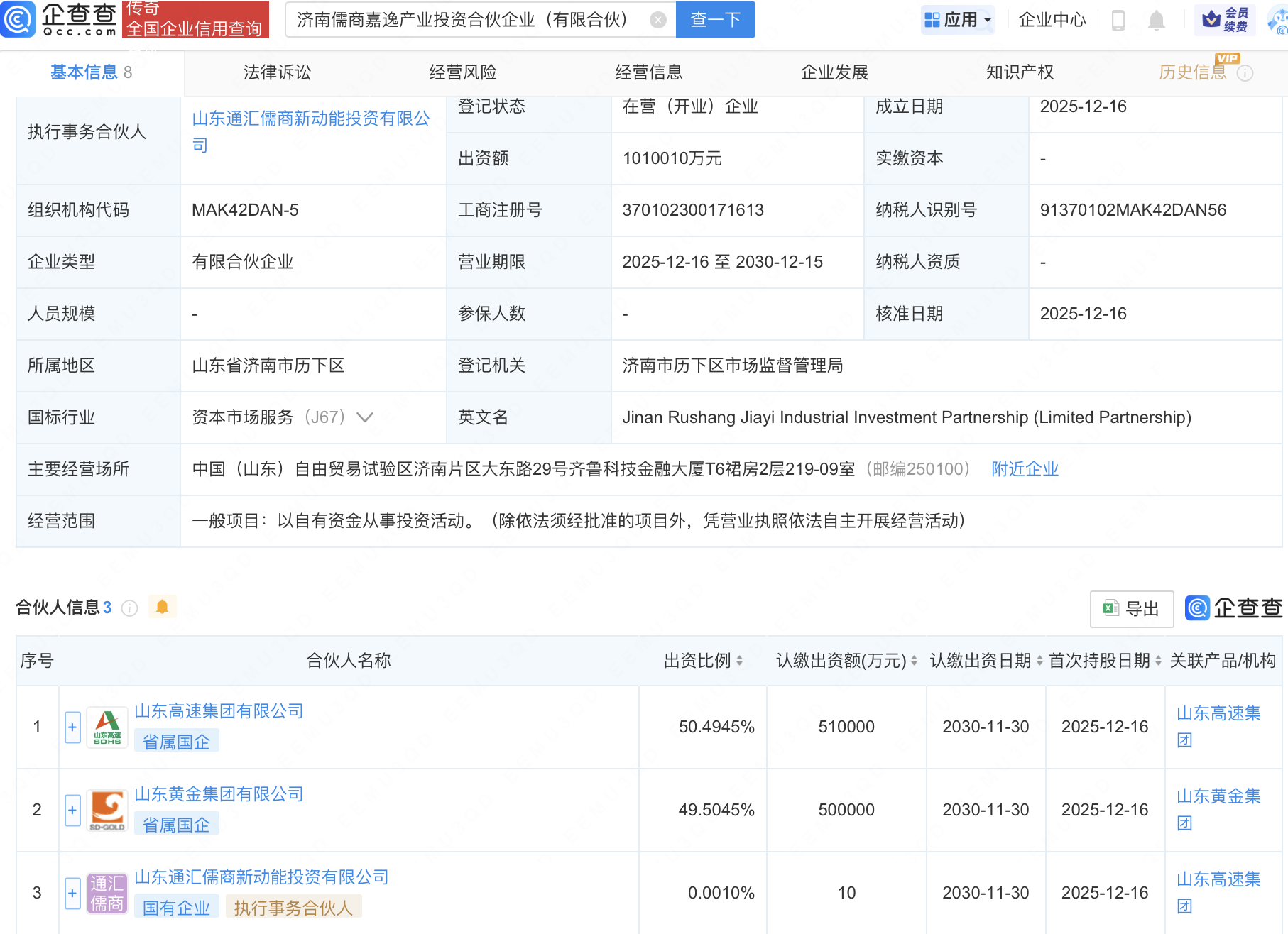 近日最好的股票配资平台,济南儒商嘉逸产业投资合伙企业(有限合伙)成立,出资额约101亿元,经营范围包含:以自有资金从事投资活动。企查查股权穿透显示,该企业由山东高速集团有限公司、山东黄金集团有限公司、山东通汇儒商新动能投资有限公司共同出资。